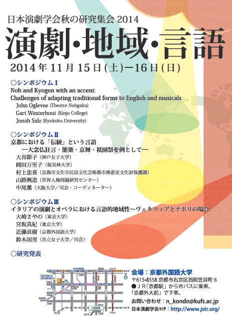 グローバル時代を迎えて、リングア・フランカとしての英語は普及しつつあるが、「いわく言い難い」ものの表現と共感は充足させられるどころか、以前にもまして複雑化する現実の中で、多言語による演劇も各地で試みられている。それでは、ノンバーバルなコミュニケーションはどうかというと、それを潜在的に成立させている「ジェスチャー」は、一国内にあってすら、地域ごとに異なることも珍しくない。本研究集会は、こうした地域性の問題から、演劇を成り立たせている様々な「言語」を問い直すことを目指す。それは狭義の方言演劇のみならず、演劇に描かれた中央と地方の関係、特定の地域の特殊な文脈の中で成立した演劇、巡業にまつわる地域ごとの改編など多岐にわたる主題を想定している。そして過去に特殊な文脈の中で、今では失われた言語で書かれたテクストを、別の地域のアクチュアリティに置き換える時にも、やはり意識せざるを得ない問題である。